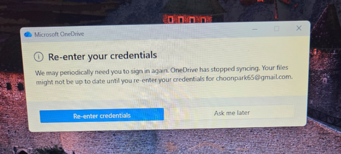 윈도우 운영체제에는 Microsoft의 클라우드 서비스인 OneDrive가 기본 프로그램으로 포함되어 있습니다. 사용자가 직접 실행하지 않더라도 시스템이 업데이트되거나 계정 정보가 변경될 때 “로그인하여 파일을 보호하라”는 취지로 자격 증명 재입력 창을 띄우게 됩니다.